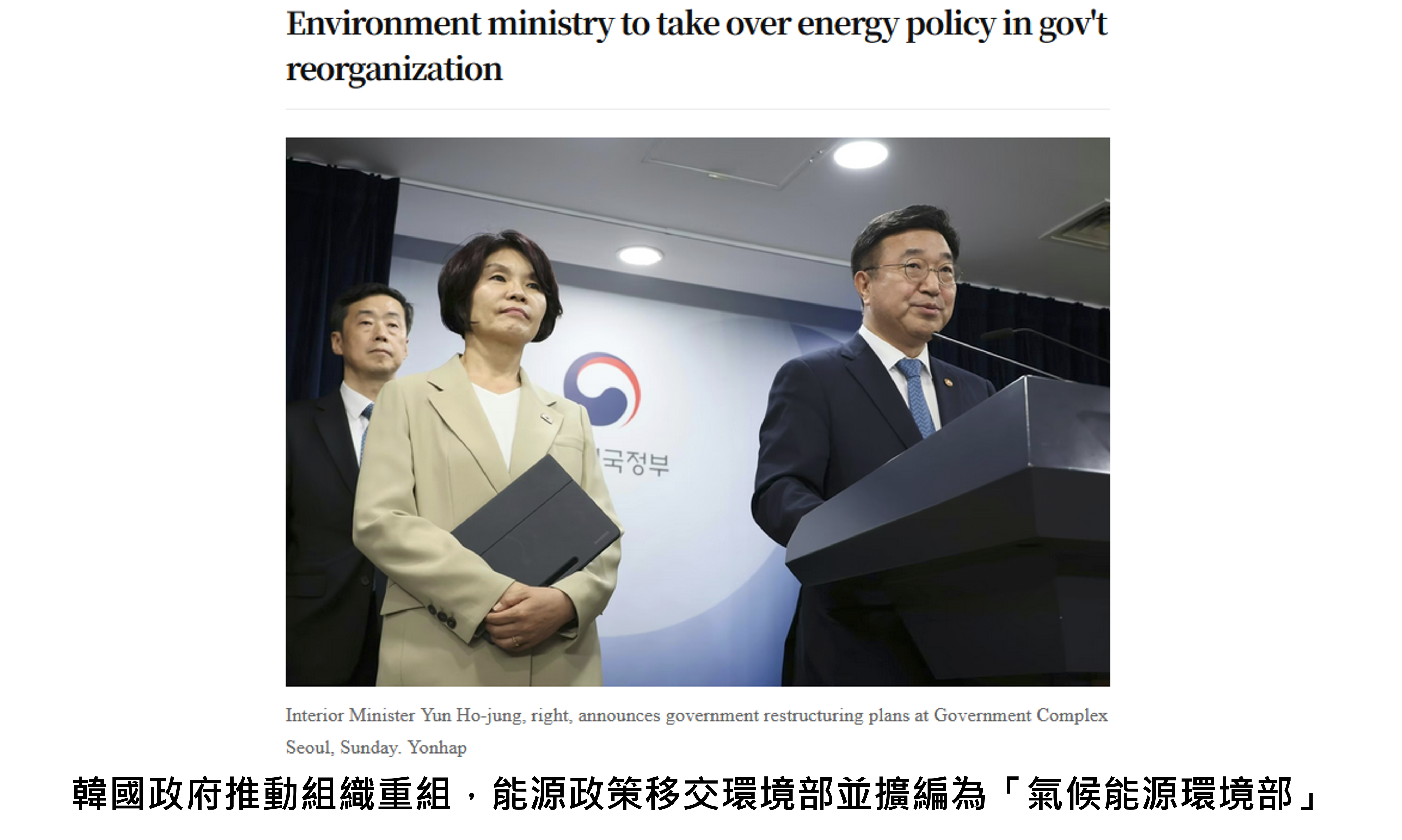 能源政策(政策目標、法規) 韓國政府推動組織重組,能源政策移交環境部並擴編為「氣候能源環境部」,輿論顯示恐引發能源安全與治理效率疑慮