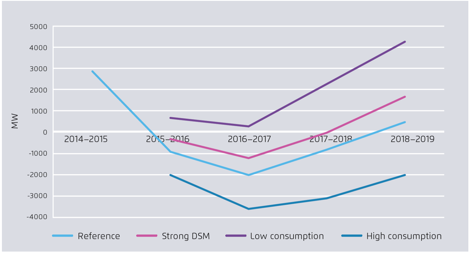 為了可以反應預估短缺的裝置容量,法國輸電調度中心建立了一項指標適當裕度(adequacy margin),用來反應多少裝置容量被移除後,仍可以滿足缺電期望值3小時內的需求。在基準情境假設下,預估2015-2016年冬季將短缺900MW,在2016-2017年冬季將短缺2,000MW,而在2017-2018年冬季將短缺800MW,其各種情境分析結果詳如圖1所示。