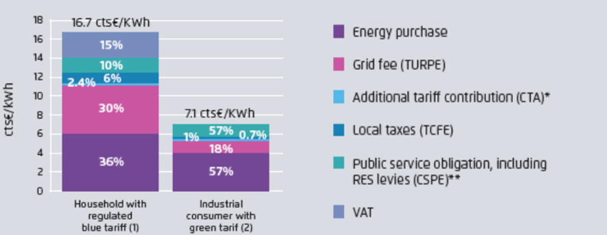 相較於德國,法國的電價較為便宜,2013年法國住宅用電的電價為16.7歐分/度(以一般家庭平均用電量4,251度電計算),工業用電的電價為7.1歐分/度(以工業用電介於2,000萬~7,000萬度計算),其電價結構表如圖2所示,其中能源購買(Energy purchase)即為發電之成本、電網費(Grid fee)則為電力輸配送之成本、地方稅(Local taxes)與增值稅(VAT)則為繳納給地方政府與中央政府的稅,公共服務費(Public service obligation)則是用來補貼低收入家庭與發展再生能源的資金。而附加費(Additional tariff contribution)則為2004年起開始附加於電網輸配的費用,主要是用來發予電力事業員工的津貼與退休金。