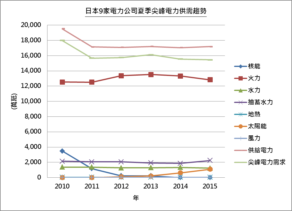 圖1、日本9家電力公司合計之夏季尖峰電力供需趨勢[1]