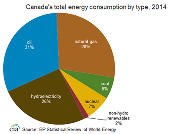 2014年加拿大為全球第五大能源生產國,僅次於中國大陸、美國、俄羅斯和沙烏地阿拉伯。主要的燃料消費為石油(31%)、天然氣(28%)和水電(26%),如圖1。