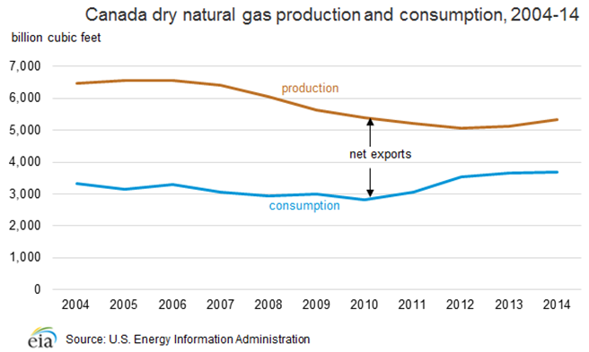 圖3、2004年~2014年加拿大天然氣的生產與消費[1]