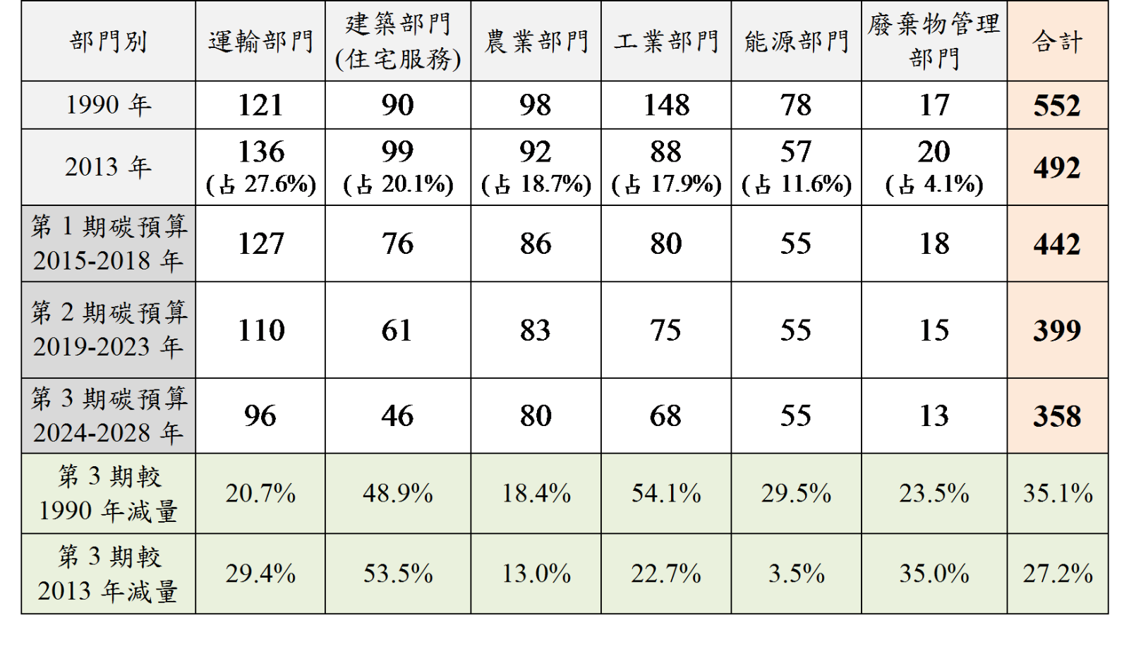 依據法國各部門的溫室氣體減量目標,如表1所示,第3期碳預算相較於2013年,以建築部門的減量最多,達53Mt,其次為運輸部門40Mt、工業部門20Mt,此顯示建築部門和運輸部門為法國未來加強減量的對象。