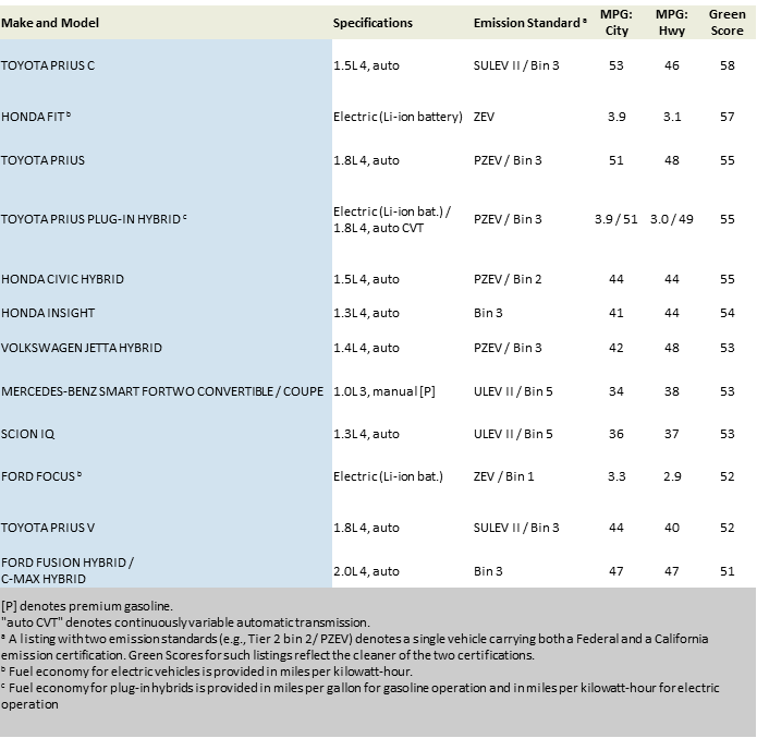 - 今年榮登ACEEE綠色汽車榜首是2012年在美國汽車市場首次亮相的豐田 Prius C油電混和車,此車款屬於豐田Prius車款,欲傳達節能(clean)、小型(compact)、及都會(city)等三大特性,其綠色分數得分為58分。而Prius系列之原車款(#3)、新型插電式油電混和車(#4)與Prius V車款(#11)亦列於綠色車輛前十二名排行名單。