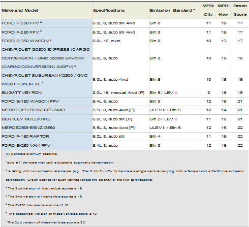 - 非盈利組織「美國能源效率經濟委員會」(American Council for an Energy Efficient Economy, ACEEE),針對2013年車款評分每款車之綠色分數(Green Score)。而綠色分數的計算因素除了包括燃油效率和汽車所直接排出的污染物或廢氣外,今年評估方法因多方考量環境面影響而進行調整,其中包含車輛製造過程與使用燃料之排放和舊車或廢車處理的汽車重量等因素。