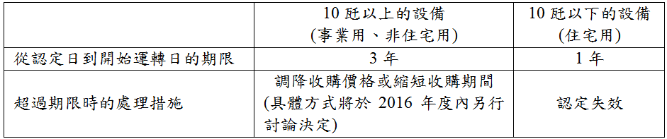 (三) 太陽光電設備的成本持續下降,每年度的FIT收購價格也跟著降低,為防止取得認定後拖延施工、套取更多利益再建置的情況發生,太陽光電的認定規則從2016年8月1日起變更,對於8月1日以後與電力公司(輸配電業者)簽定併網契約的太陽光電設備,設定從認定取得到運轉開始的期限,以及對於超過期限的處理方式,如表1所示。