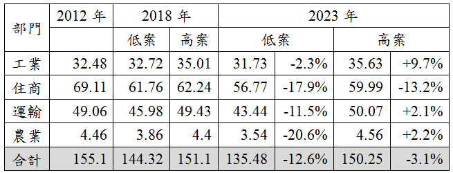 表3、最終能源消費(Mtoe)相較於2012年增減情況(部門別) [3]