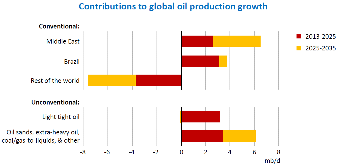 - 美國輕質緻密油及巴西超深海洋石油的生產將持需增加到2020年代中期,但中東仍是長期石油展望的關鍵。