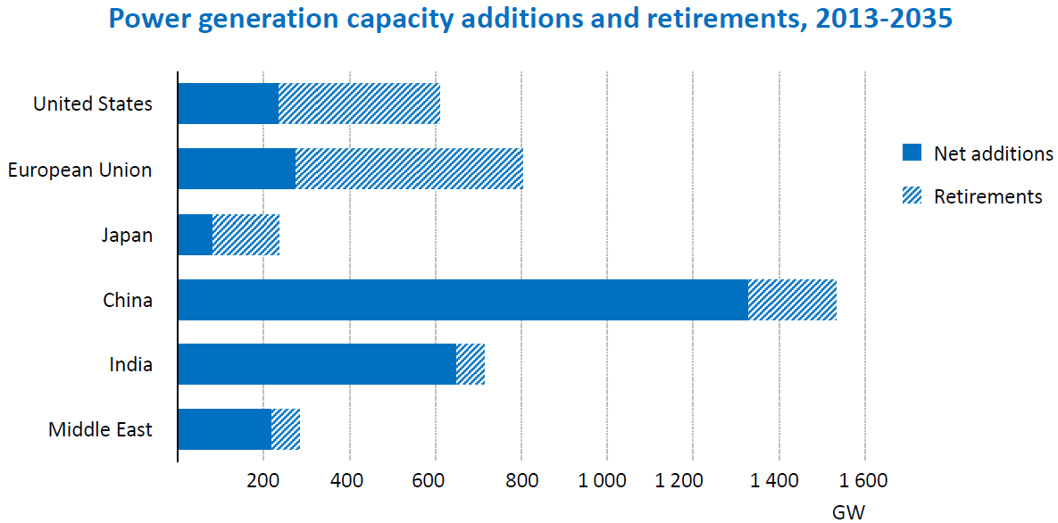 - 中國大陸及印度合計建造全球約40%的新電廠。在OECD國家,60%的新電廠用來替代除役的電廠。