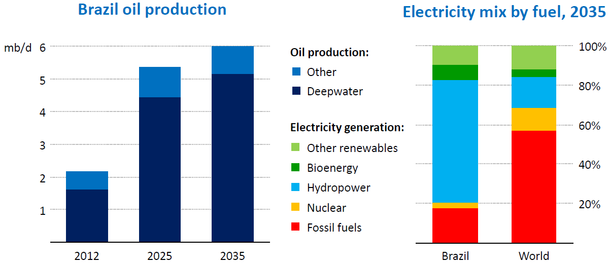 - 巴西近期在深海油田的發現,到2035年石油生產將增加3倍,達到600萬桶/日,占全球石油生產淨成長的1/3,使巴西成為世界第6大石油生產國。