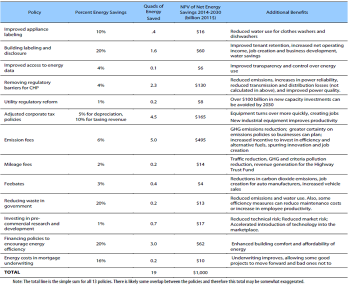 - ACEEE報告中指出住宅與服務業建築物、工業、運輸部門之各項重要策略及經濟利益,針對每項決策提供其立法歷史簡要說明、相關成本和受益以及對未來政策的設計建議。透過這些建議,政府國會與立法機構可規劃國家未來經濟發展與節能減碳之最適行動藍圖。