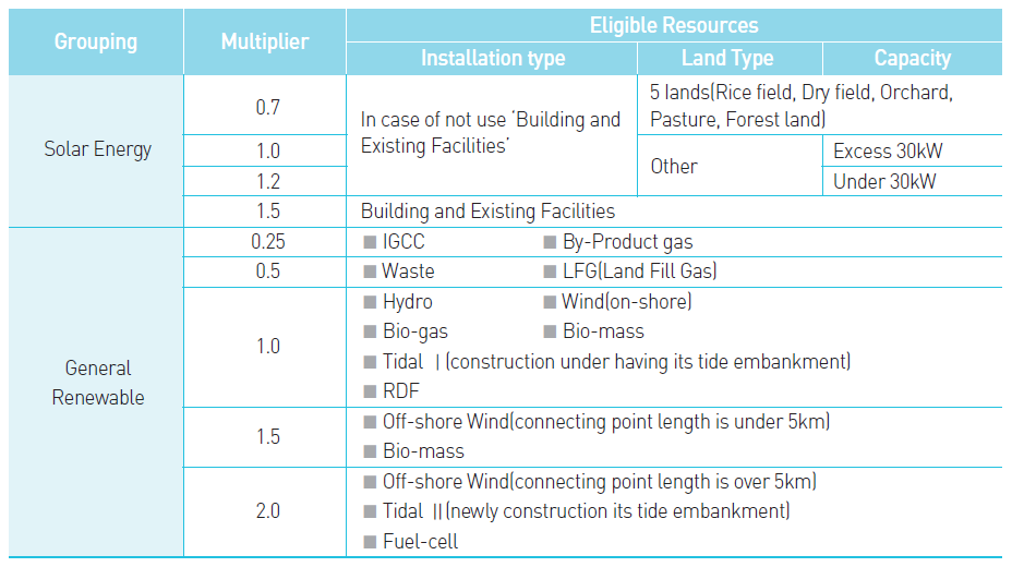 南韓依據不同的再生能源類型與規模設定不同的計算權重,以均衡或刺激某些類型的再生能源開發。