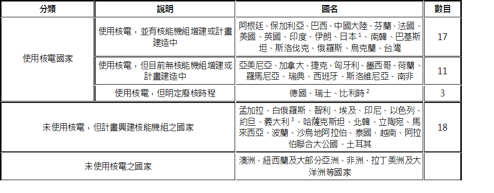 - 依據2013年世界核能協會資料(如表一),國際中擁有核電的31個國家,使用核電並有核能機組增建或計畫建造中的國家有17國,使用核電但目前無核能機組增建或計畫建造中的國家有11國,使用核電但明定廢核時程的國家有3國;另外未使用核電,但計畫興建核能機組之國家有18+1國(需再增加阿爾及利亞國家,共約90-370部核電站)。至於未使用核電之國家多分布在澳洲、紐西蘭及大部分亞洲、非洲、拉丁美洲及大洋洲等地區。