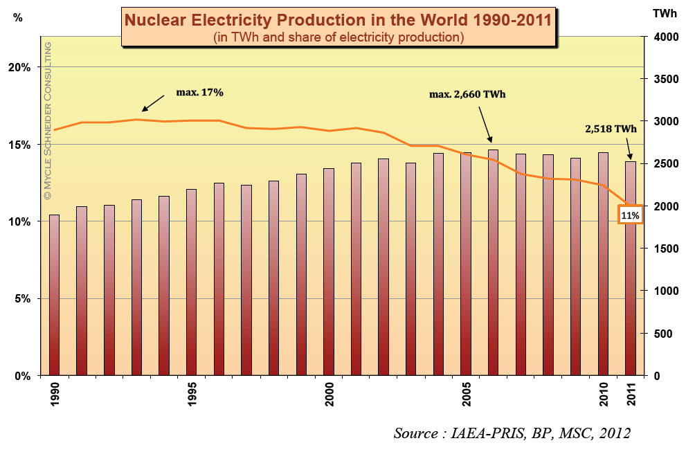 - 依據IAEA-PRIS, BP, MSC 2012資料,世界核能發電比例由1995年的17%尖峰緩慢下降到2010年約12.5% (2011年因福島事件導致日本境內的核電廠近於停核,所以核能發電占比下降到約11%);但是實際發電量並未明顯減少(圖一)。未來若各國興建中的核電廠加入營運後,國際間實際的發電量有可能會增加。至於近幾年核能發電占比減少原因,則為各國其他類別的發電裝置容量增加所造成,並非減少核能發電之故。