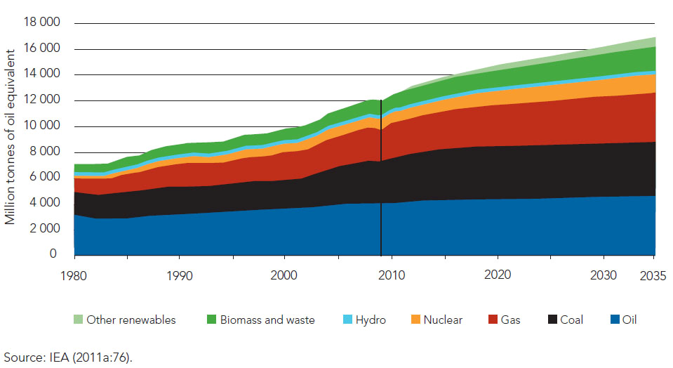 圖二、1980-2035年新政策情景推估之世界初級能源需求(百萬噸油當量)
