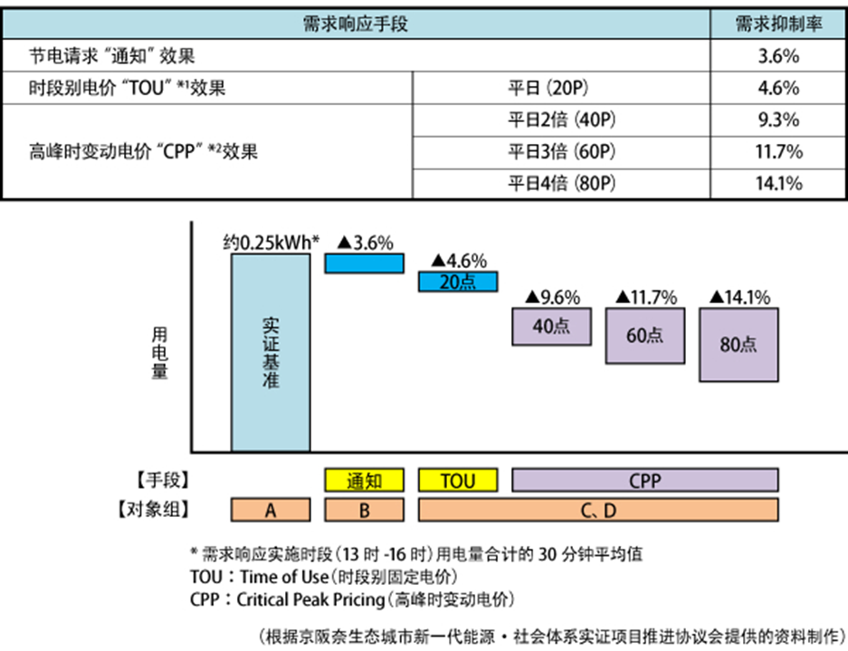 京阪奈在約四萬用電戶中,有681戶自願參加需量反應實驗,在此項目中,針對夏季(7月到9月)和冬季(12月到2月)為中心進行實施。2012年夏季的實施結果已經出爐,而冬季的結果正在觀測中。以下為其實施內容和成效。