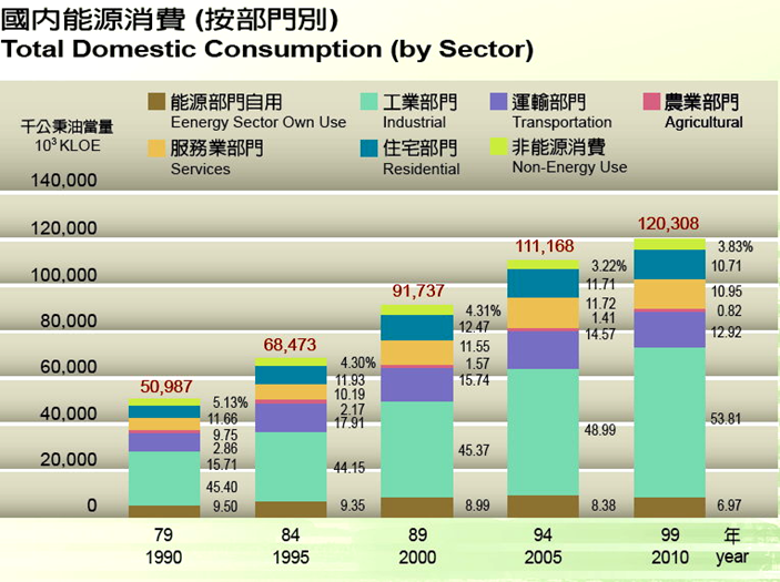 圖1、台灣各部門使用能源比例(2010年能源統計手冊)