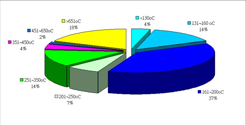 圖2、不同溫度範圍內工業廢熱量比例圖(資料來源:能源查核統計資料)
