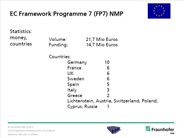 歐盟最主要的熱電技術研發計畫為Framework Programe(FP),熱電計畫由FP4發展到現今的FP7,FP7的計畫經費高達1470萬歐元,研究計畫數量為39個,如圖1所示。其中以德國獲得10個研究化為最多,由於足夠的研究經費支持提升歐洲各國的熱電研發能量,其結果反應於熱電研究投稿數量逐年增加,如圖2所示。