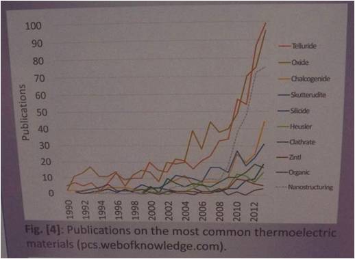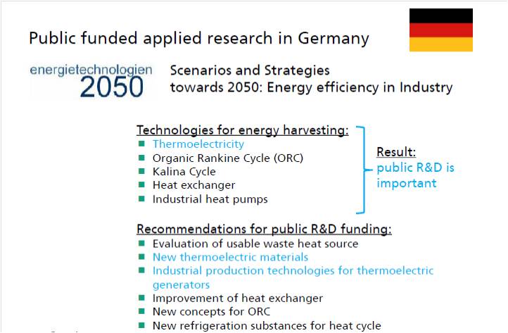 Harald Bottner教授所發表的熱電相關論文達100餘篇且擁有20熱電相關的專利。Harald Bottner教授簡述德國的能源政策方針,預定在2050年之前提昇工業能源使用效率,提升效率的技術如圖4所示,包含:熱電技術、ORC技術、Kalina cycle技術、Heat exchanger技術和工業的熱泵技術。其中研究方向為可用廢熱源分析、新熱電材料開發、工業產品等級的熱電發電機、改善熱交換、新的ORC概念、熱電技術的研究方向為新材料開發、給熱循環使用的新冷凍物質。由此可知德國認為固態熱電發電用於工業廢熱回收再利用是很有潛力的技術,因此也投入大量研究經費培養國內熱電領域人才以及熱電技術相關的基礎研究。我們都知道目前熱電技術的瓶頸在於能源轉換效率不佳,連帶導致系統成本昂貴,而無廠商願意投入此領域。厚實熱電相關基礎研究,才有機會研發高性能熱電材料以突破瓶頸。