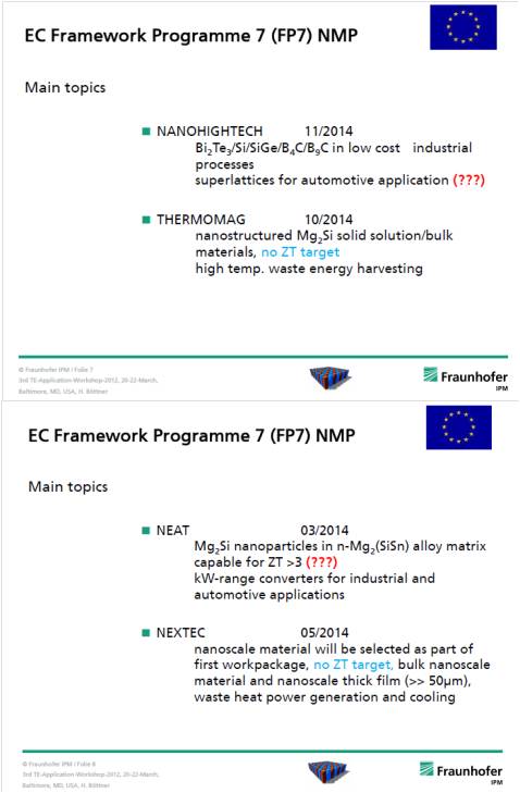 上述歐洲熱電發展歸納可知,目前FP7計畫目標大致可分為3個方向,第一為奈米技術導入提昇材料ZT值,第二為鎂矽熱電材料開發,最後為廢熱回收再利用。