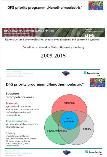 德國科學研究基金資助熱電研發計畫為『DFG priority program』,計畫明確指出奈米熱電材料為計畫研發主軸,利用奈米效應提升材料熱電性質。『DFG』計畫方向為材料開發,熱電特性研究以及理論研究,以提升熱電材料性能。其中材料種類包含鉍碲奈米結構合金、3-5族合金(如,PbTe...)、Antimonides(Zn4Sb3,CoSb3)、Heusler、矽基材料、矽基奈米材料以及氧化物熱電材料。