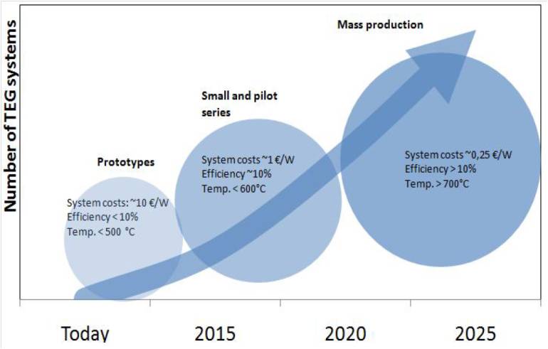 歐洲熱計畫『Framework Program』對於熱電發電應用的市場需求與規劃目標(圖6)。其發電效率以及使用溫域逐年提升,發電效率由先今低於5%提高至大於10%在2025年; 同時,其使用溫域提高至大於700 °C。現金熱電發電系統成本為10歐元/W,目標在2025年下降至0.25歐元/W,使熱電發電系統更具競爭力。
