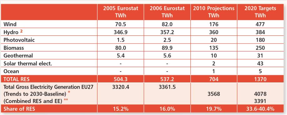 表1顯示2005、2006、2010年再生能源產生之發電量與2020年預期獲得之發電量,以數據統計至2020年再生能源發電將達到總電量的33~40 %,而風能發電將會是最大宗。