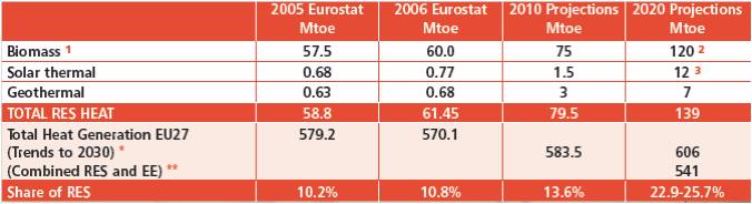 隨著再生能源成長,再生能源產生之熱能也會跟著增加,如上表2所示,至2020年再生能源產生之熱能將達到總熱能的25 %。如能以生質、地熱、太陽能能源整合熱電發電系統,將造成更多的可用能源。