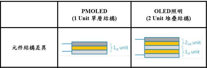 如圖1所示,由於PMOLED屬於1 Unit結構,而OLED照明為多單元堆疊結構,所以在蒸鍍有機薄膜的程序上,OLED照明所需的製程成本較PMOLED高,也因此在材料的使用量上OLED照明也較PMOLED高。假設PMOLED各功能層材料總成本為1單位,若以2 Unit堆疊結構的OLED照明來估算,單純比較其材料用量,OLED照明各功能層材料用量約為PMOLED的2倍。OLED照明為了達到高效率大多需使用磷光材料搭配,而製作磷光材料由於必須使用貴重金屬作為原料,故其成本也較螢光材料高,所以比較發光層材料成本時,OLED照明會比PMOLED高3~7.5倍。