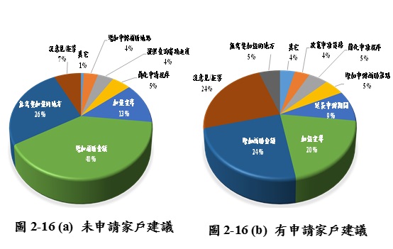 針對104年未申請家戶,占比最多的建議是「增加補助金額」占34.5%,其次是「增加宣導」占26.1%,再次以「延長申辦期間」占12.0%,而其餘政策建議比例均不到一成,詳如圖2-16 (a)。另針對104年有申請家戶,占比最多的建議是「增加補助金額」占46.9%,其次是「加強宣導」占15.1%,其他另有「簡化申請程序」(6.0%)、「提供民眾查詢審核進度」(5.1%)及「增加申辦補助地點」(4.6%)居第三,詳如圖2-16 (b)。