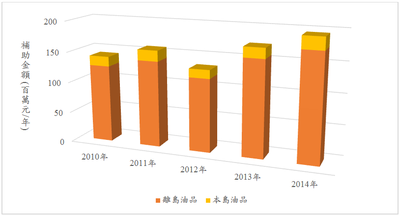 2010年至2014年,政府補助油品業者每年約1.3~1.9億元。如下圖1所示,2010年油品的總補助金額約1.4億元,2011年補助支出增加到1.6億元左右,2012年約略下降至1.3億元,2013年補助金額約1.7億元,而2014年總補助支出為1.9億元左右。其中,離島地區的油品補助金額佔油品總補助金額的89%~90%,離島地區的補助金額遠高於臺灣本島偏遠與原住民地區的補助金額。