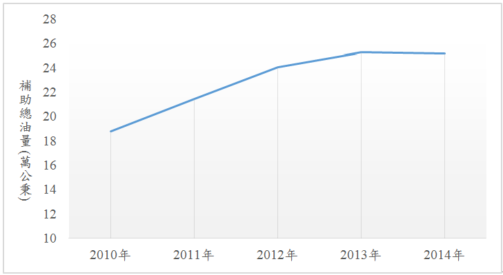 圖2 2010年~2014年補助總油量(單位:萬公秉/年)