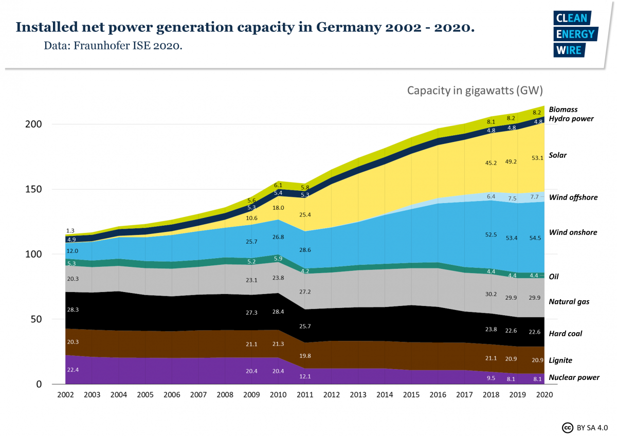 - 由圖1看來,煤炭和核能因占比較低(約14%)將可能輕易地被再生能源取代。太陽能光電、風力和沼氣的裝置容量從2000年的12 GW增加到 2020年的132 GW。但由於這些來源的發電間歇特性,且在德國本身的分佈也不平衡,大部分來自北方多風的再生能源,而西方和南方的工業中心都具備高度的能源需求,這考驗著該國35,000公里的電網傳輸能力。儘管一些專家認為只有一堆燃氣發電廠才能確保供電穩定,但其他專家卻指出,現有儲能設備和未來的歐洲互連網將是電力供應保持穩定的原因。