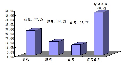 分析住宅耗能結構(如圖三),熱能的使用佔了總體住宅耗能的27%,尤其加熱型家電產品的耗能,於住宅耗能中所佔比例極高。分析目前各式家電產品,其中不論是在空調、洗衣、廚房或是衛浴設備中,進行乾燥、暖風或是加熱保溫產品,皆是以電熱形式產生熱能進行應用,估算各項加熱產品的日常使用耗電量,平均每年用電量超過1728度,超過每戶平均用電量的30%。因此在熱能利用進行節能技術開發,將可大幅降低全台灣之總體耗電量,達到明顯的節能效益。