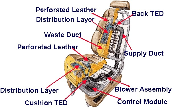 - 個人空調座椅:美國的Amerigon Inc. 開發出個人空調座椅,以熱電致冷模組作為接觸式的降溫或升溫元件,提高駕駛時的舒適度,如圖六所示。根據熱電致冷模組的特性,將電流反相時,可使模組同一面的冷端切換成熱端,可適用於不同季節之用。